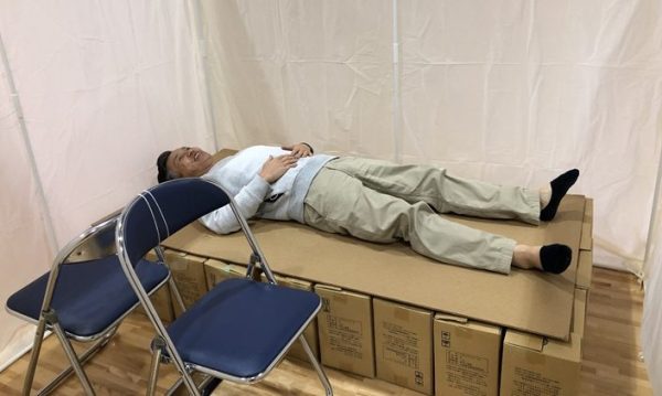 訓練に参加した久世施設長も、実際に段ボールベッドに横になり体験しました。