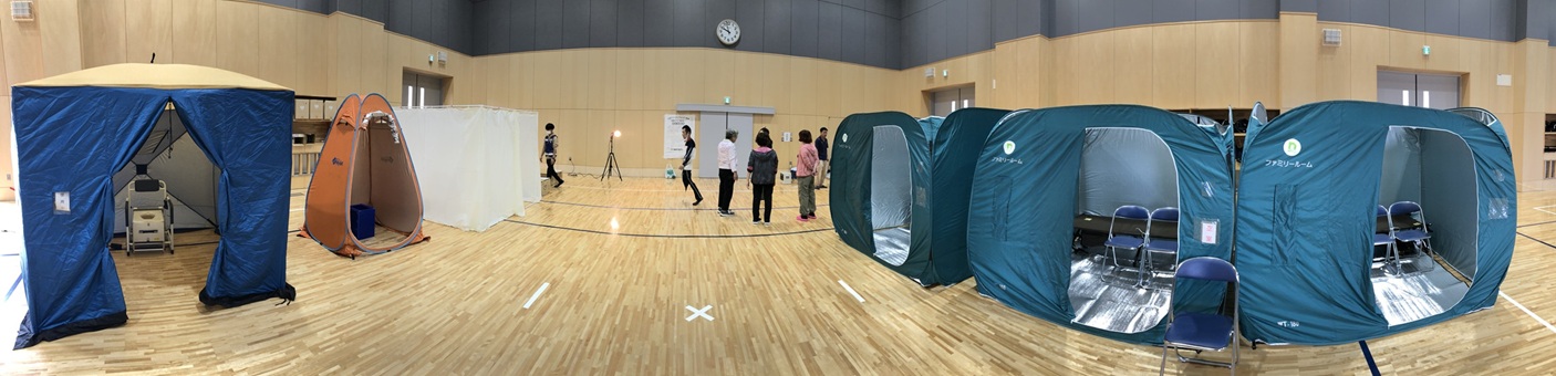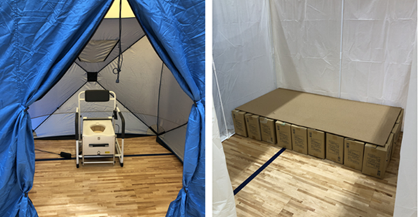 会場には、避難所で使用されるファミリールーム用パーテーション、簡易トイレ、段ボールベッドなどが設置され、来場者が実際に体験できるようになっていました。